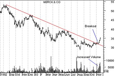 can penetrate rising and falling trendlines. Figure 21 shows the penetration of Merck's