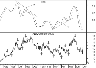 The following chart shows Checker Drive-In, its 12-day TRIX (solid line), and a 9-day