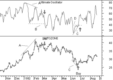 A bearish divergence occurred (lines "A") when prices made a new high that was not