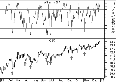 The following chart shows the OEX index and its 14-day Williams' %R. I drew "buy" arrows each time the %R formed a trough below 80%. You can see that in almost every case this occurred one or two days before the prices bottomed.