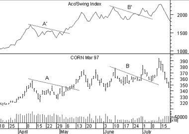labeled "A" and "B" were confirmed by breakouts of the Accumulation Swing Index trendlines