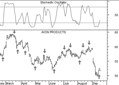 (dotted). Similarly, "sell" arrows were drawn when the %K line fell below the %D line.