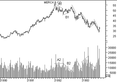 (trendline "A2"). The increase in volume during the price decline showed that many