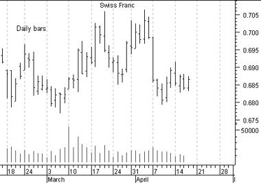 charts of a Swiss Franc contract shown in Figures 40, 41, and 42.