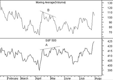 volume was declining (trendline "B"). If you only looked at the S&P 500 you might think