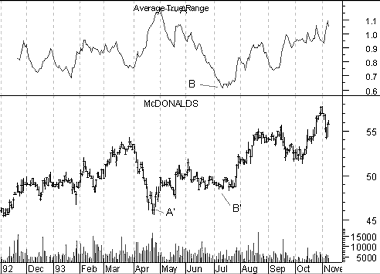 This is a good example of high volatility as prices bottom (points "A" and "A'")