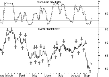 (dotted). Similarly, "sell" arrows were drawn when the %K line fell below the %D line.